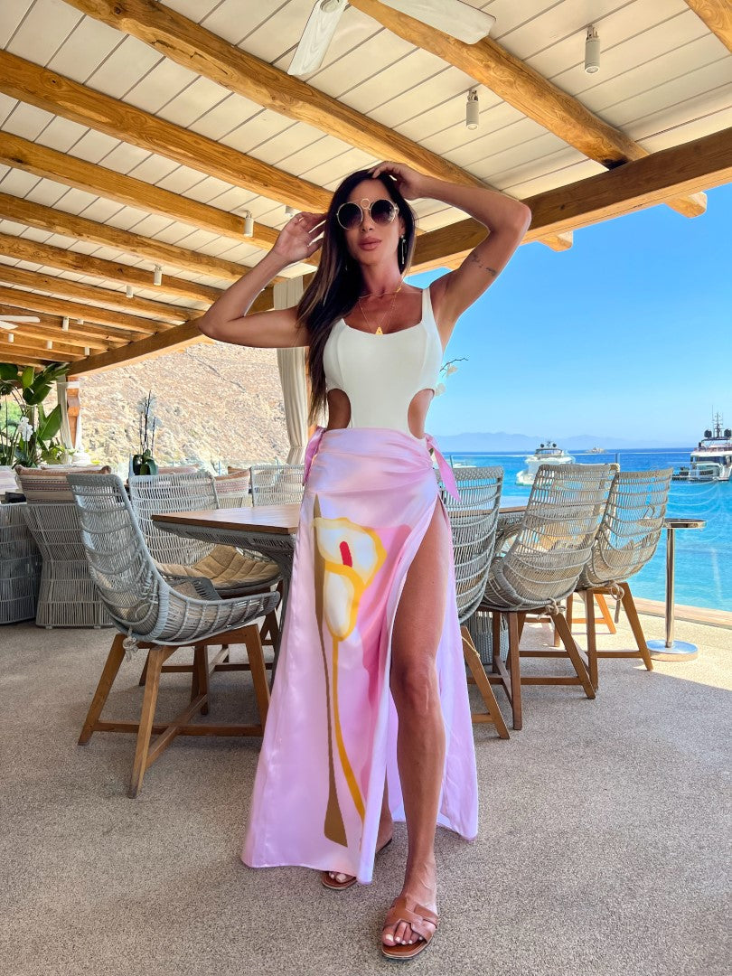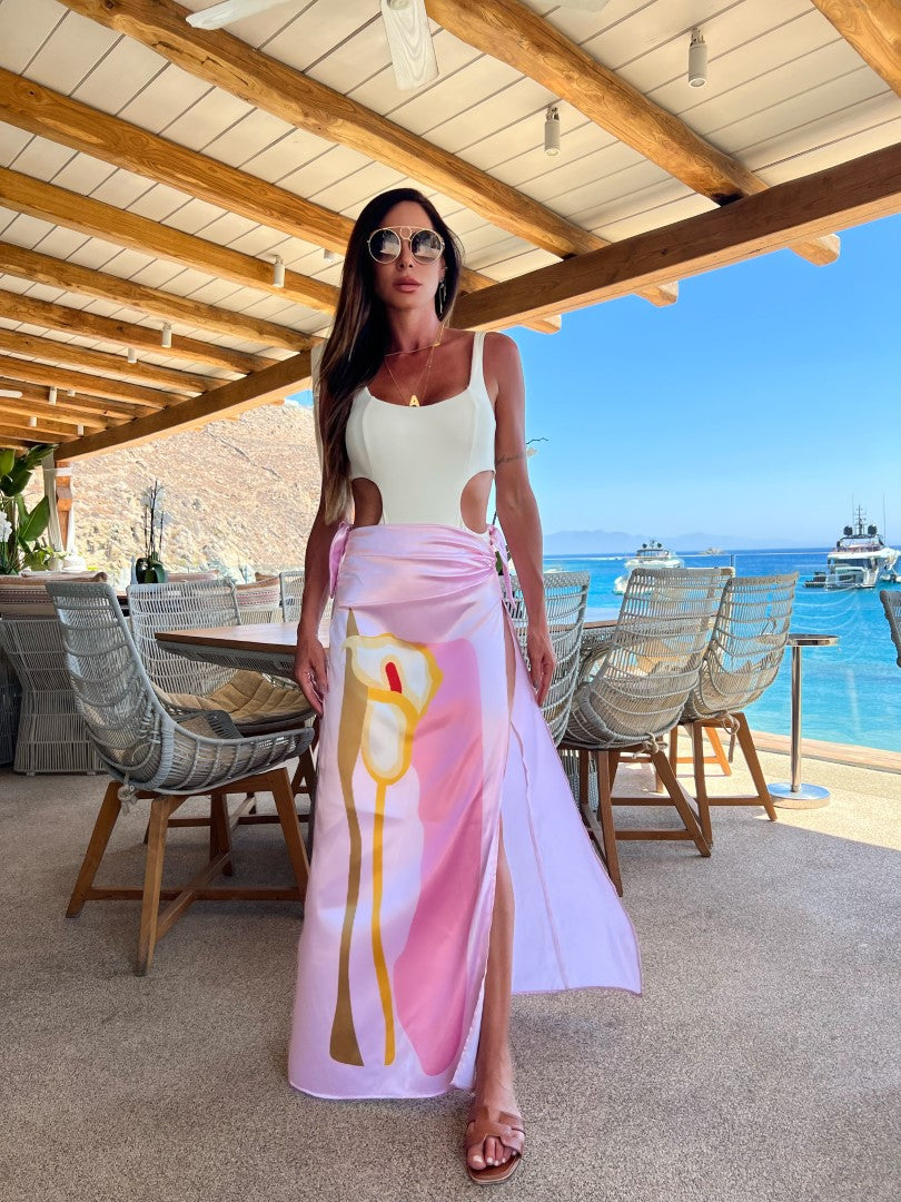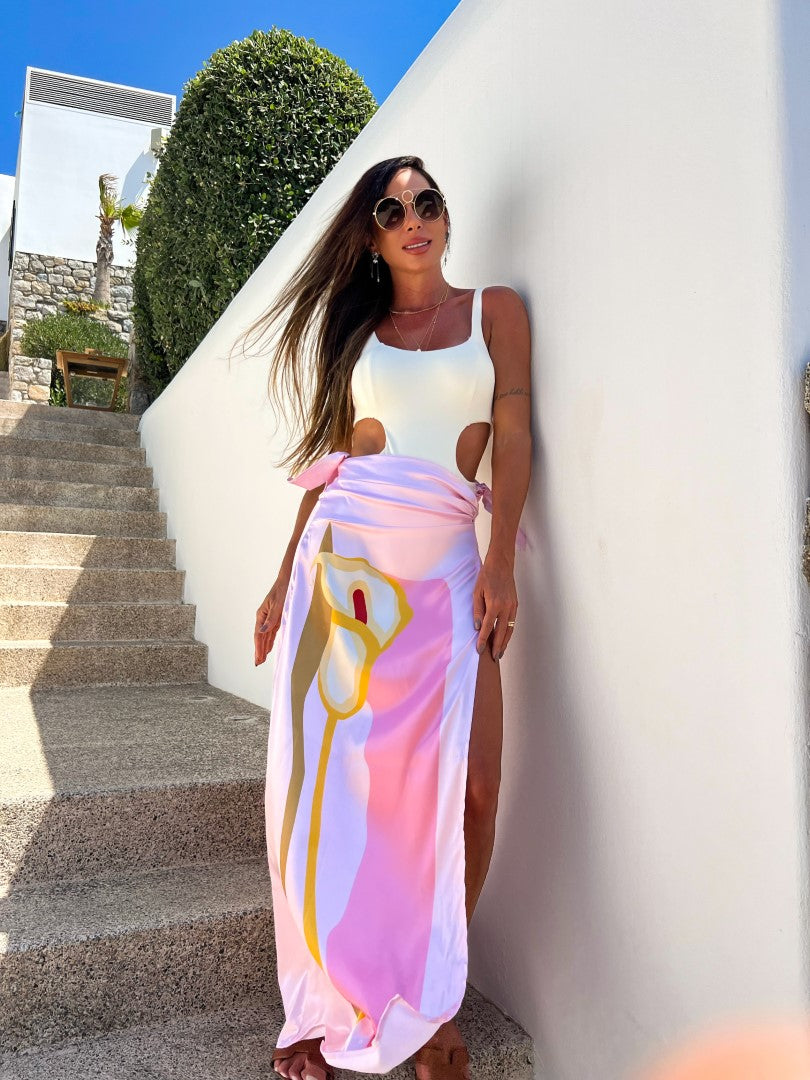 Body em malha off white com bojo embutido, recorte na cintura e laço na lateral fixa na peça. Saia acetinada estampada com forro e fenda lateral. Um look divino para o verão!