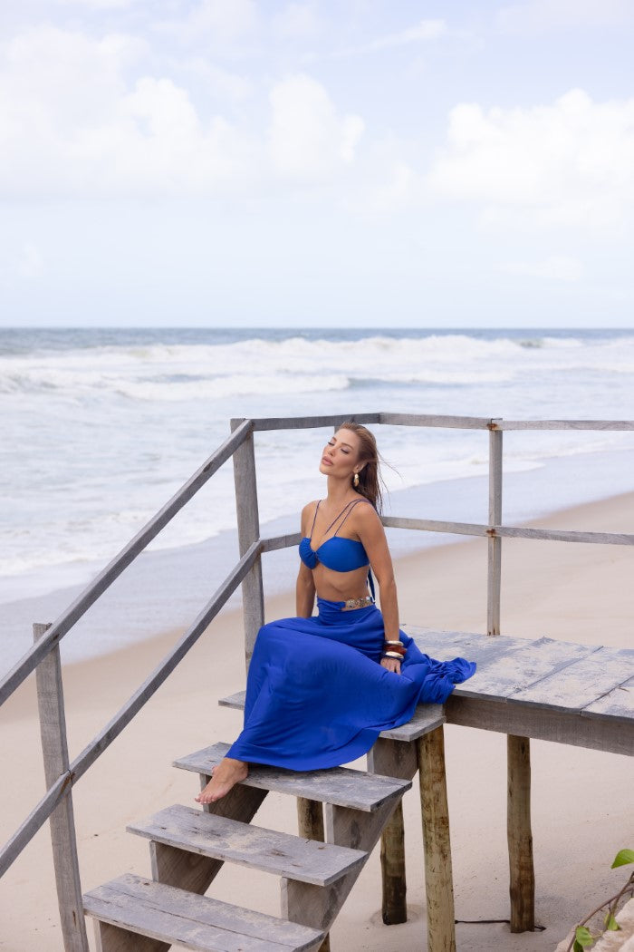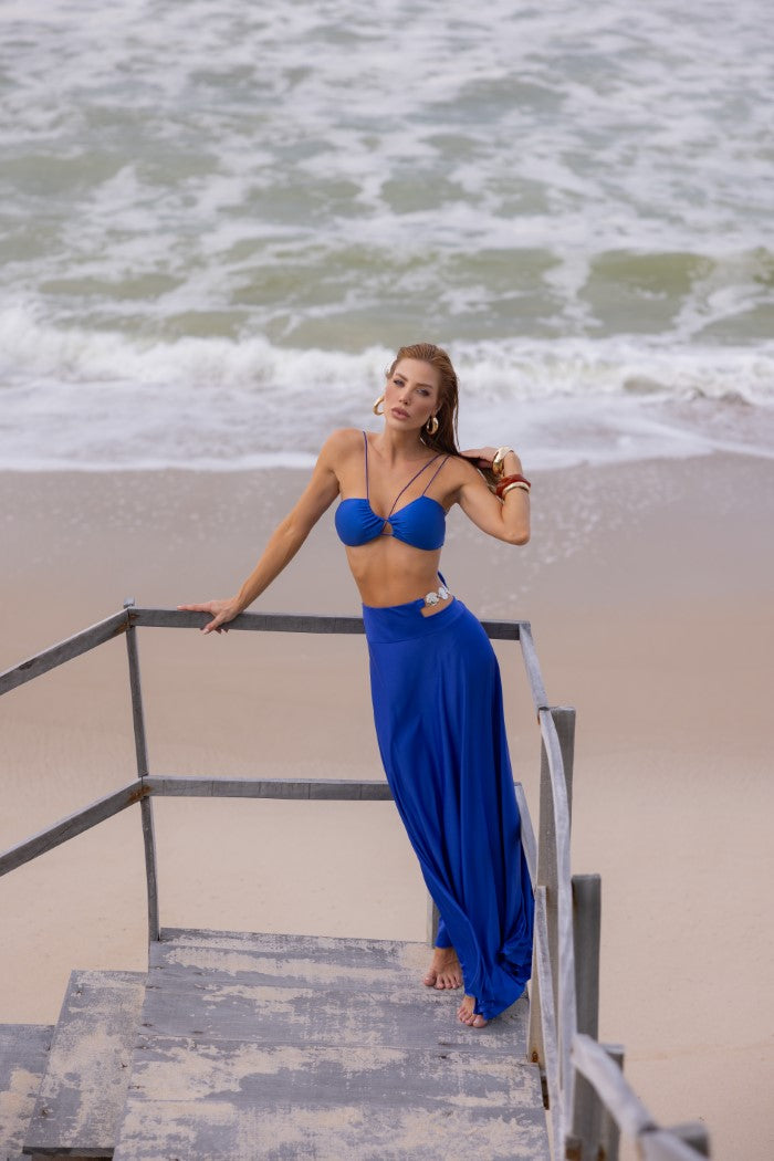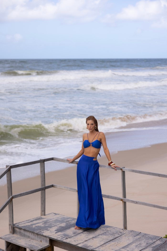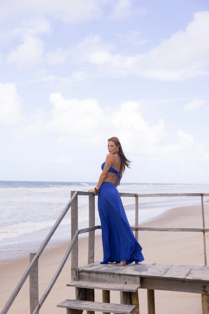 Para completar esse look, saia midi alongada com cós largo e detalhe em aviamento de medalhas na lateral trazendo brilho à peça.