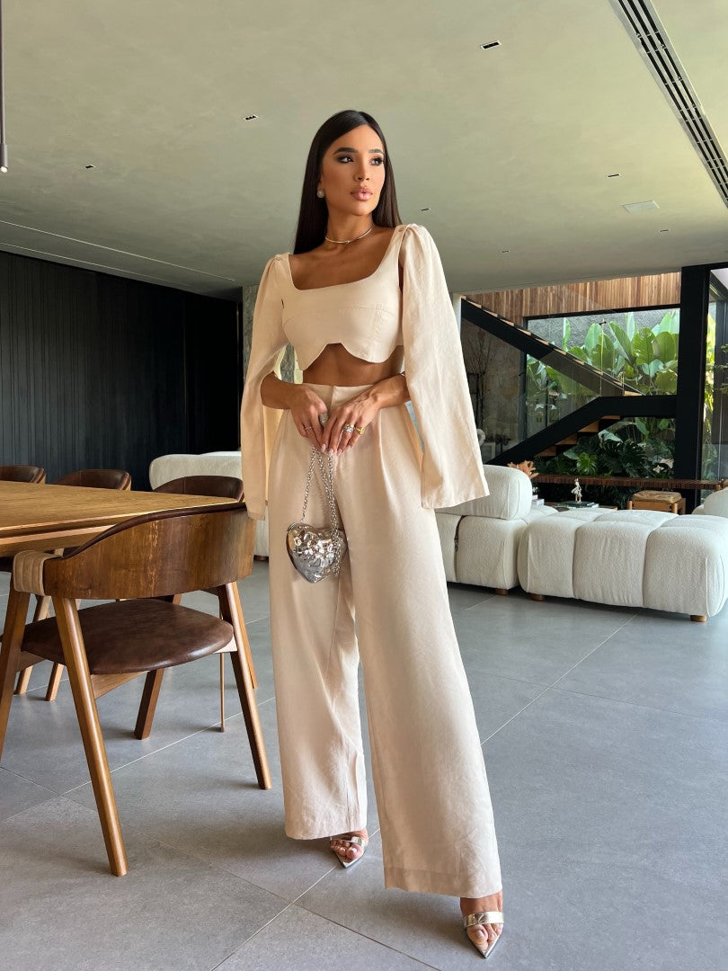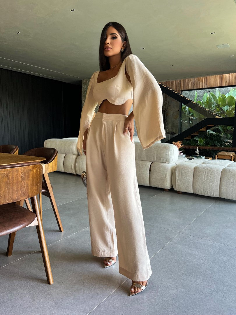 Conjunto em alfaiataria de top com bojo embutido e capas nos ombros dando alusão à manga longa. Calça cintura alta com fechamento em gancho. Um look despojado e casual.