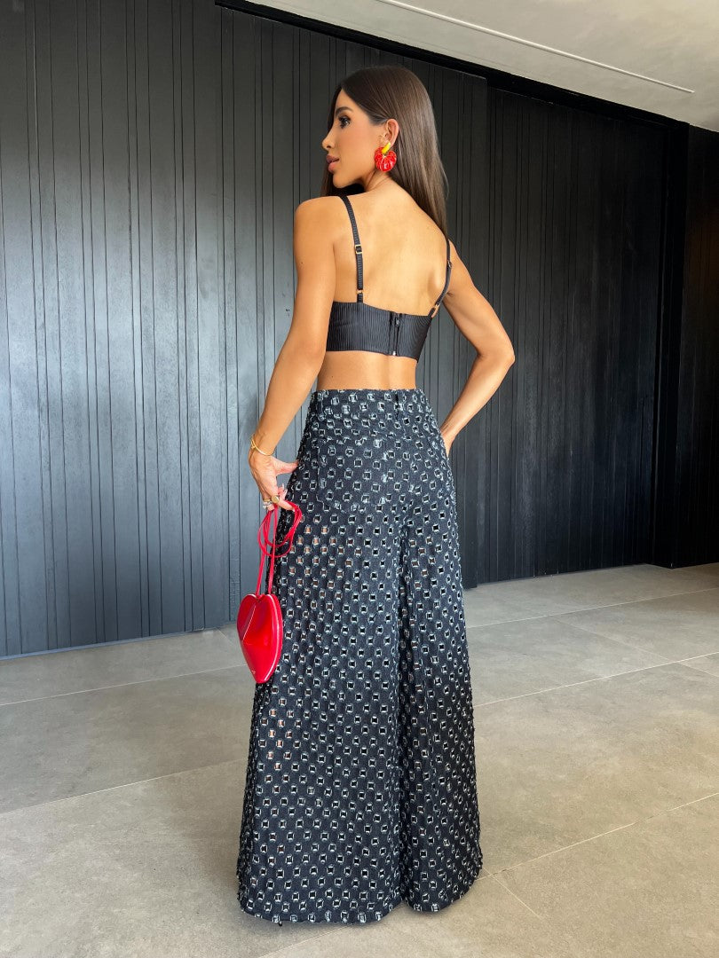 Um conjunto super style! Top cropped corte de alfaiataria em formato de coração e barrado de guipir conta com alças finas e fechamento em zíper nas costas. Calça denim destroyed dão um toque final desse conjunto despojado.