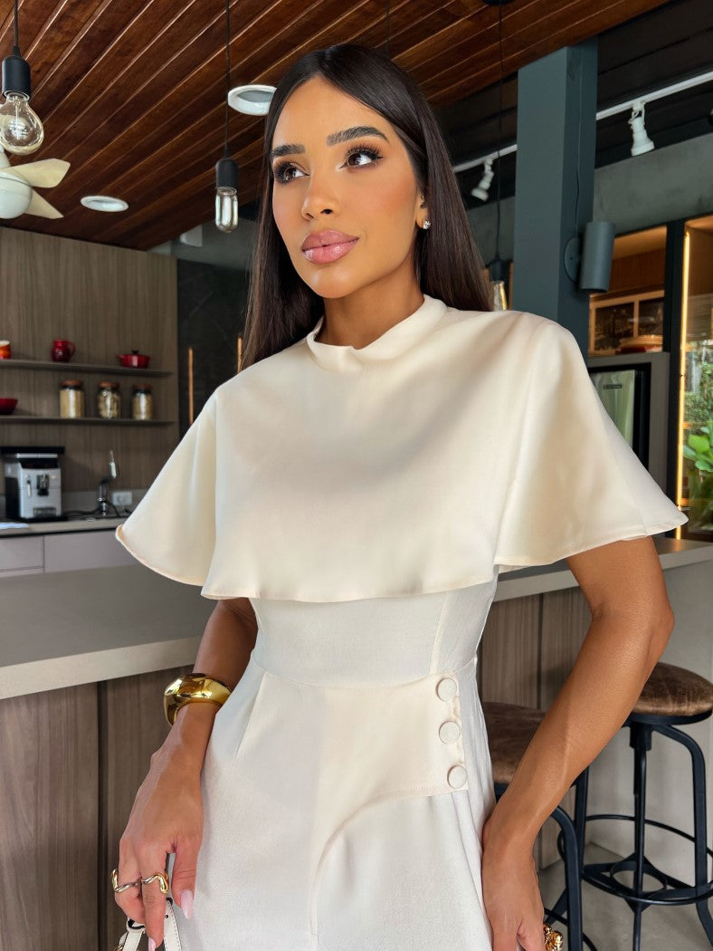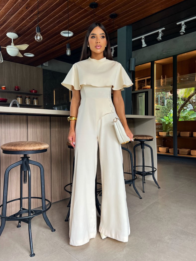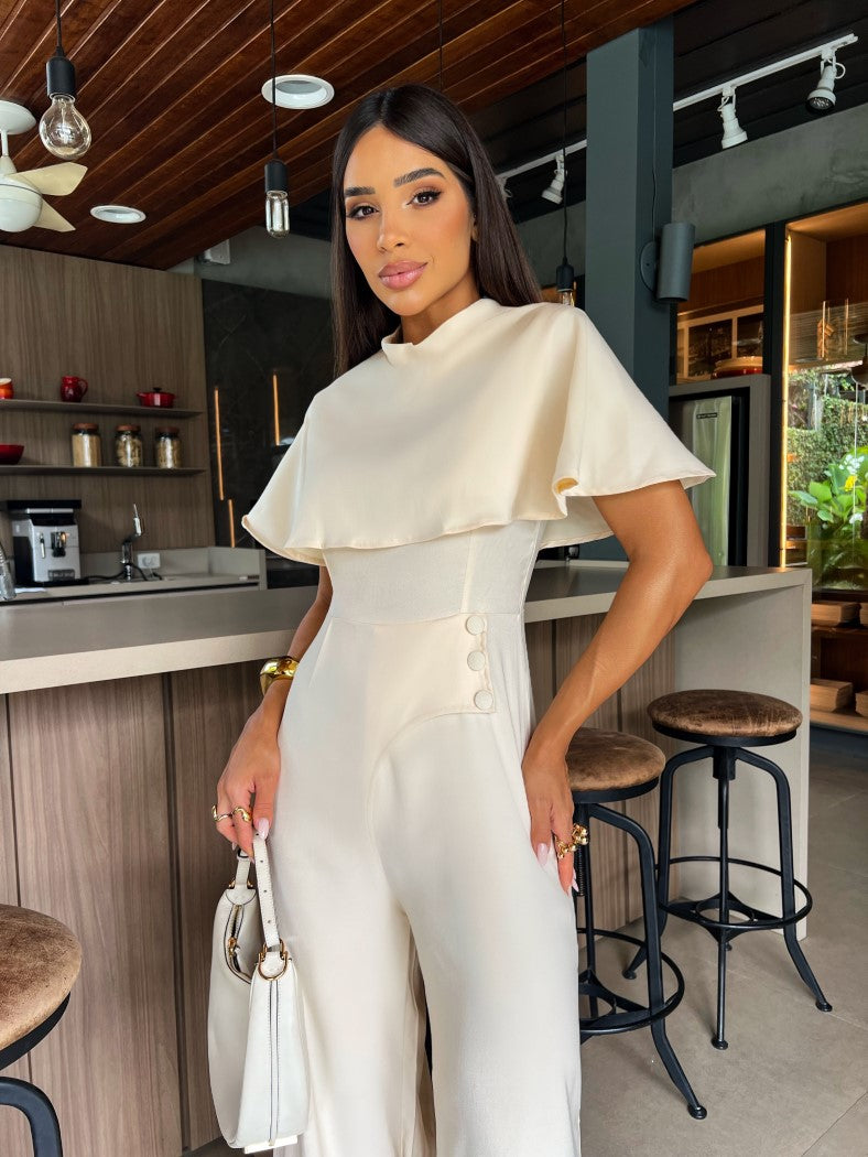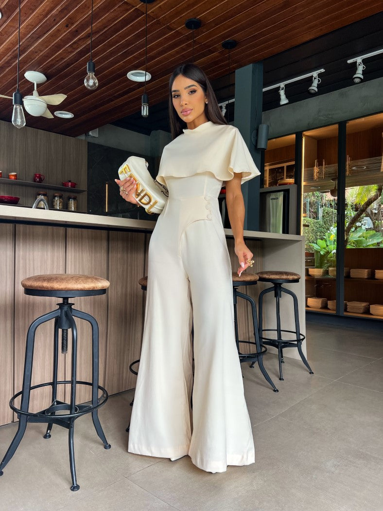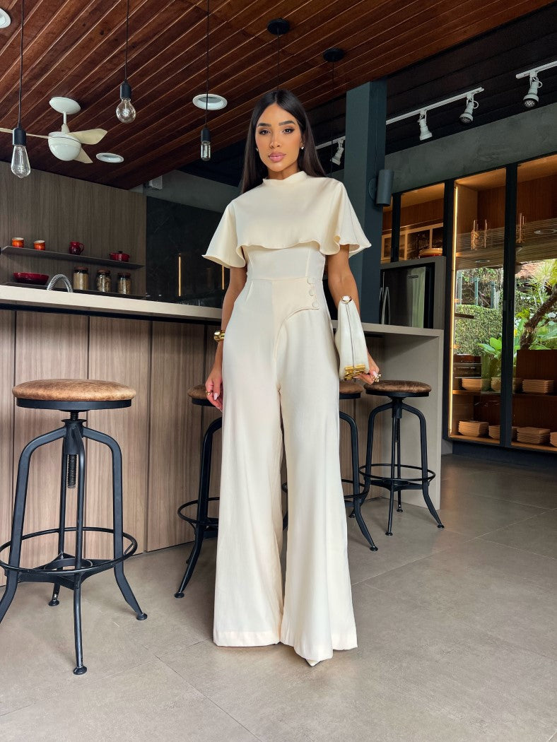 Macacão longo em tecido alfaiataria leve na cor marfim. Possui gola alta, cropped sobreposto embutido, corpo acinturado e com botões decorativos lateralizados na parte do cós da calça.