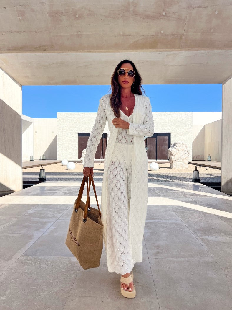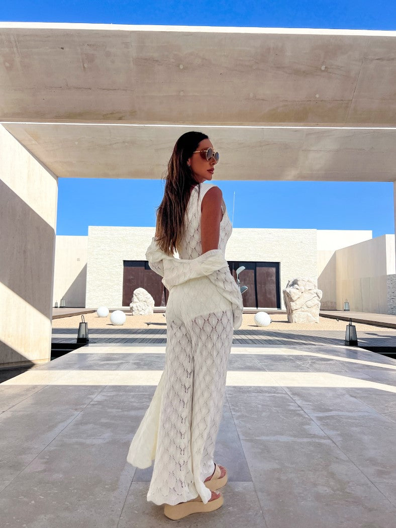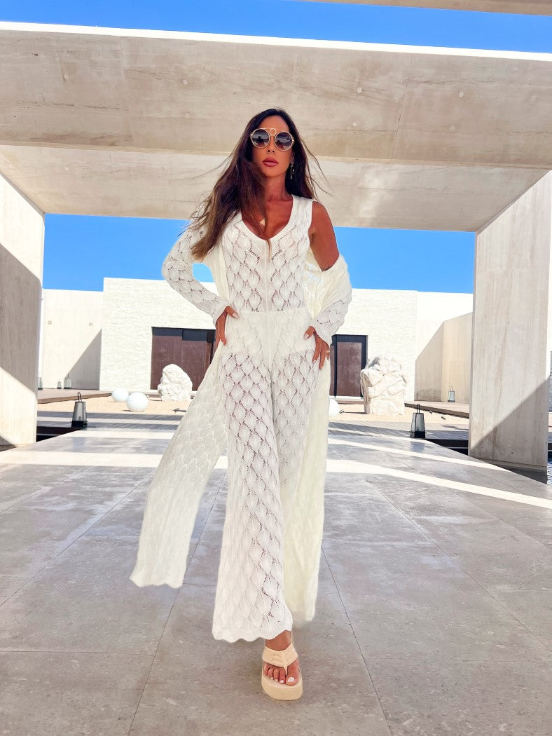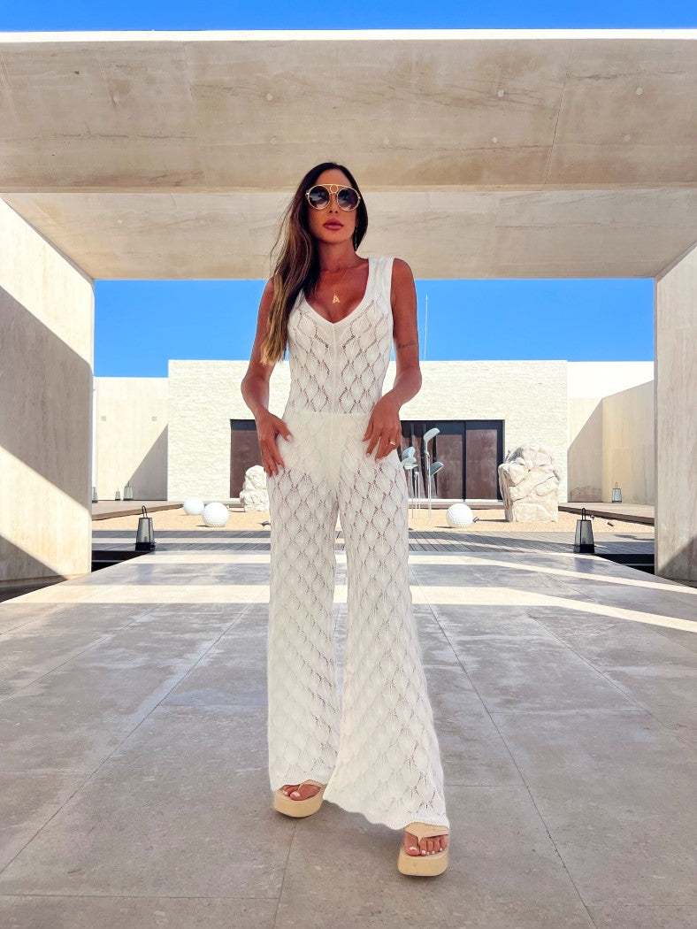 Macacão longo em crochê off-white, ideal para um look elegante e descontraído em ambientes de praia ou resort.