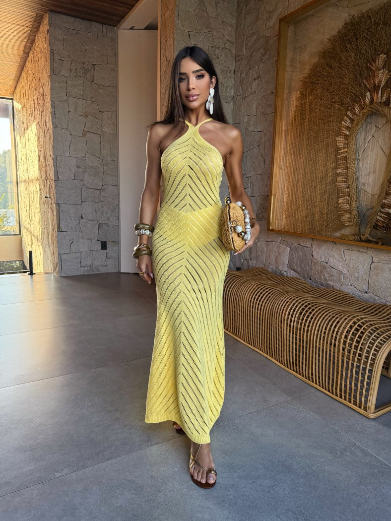 Vestido midi alongado em modelagem semi sereia, confeccionado em tricot amarelo.